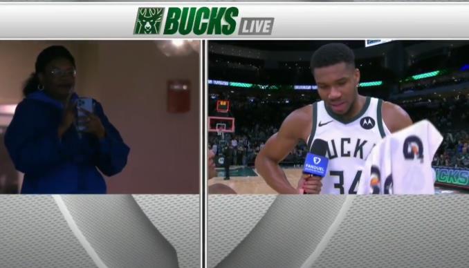 賽后現(xiàn)場響起MVP歡呼聲,字母哥的媽媽維羅妮卡也來到了現(xiàn)場,字母哥也情難自已一度哽咽。