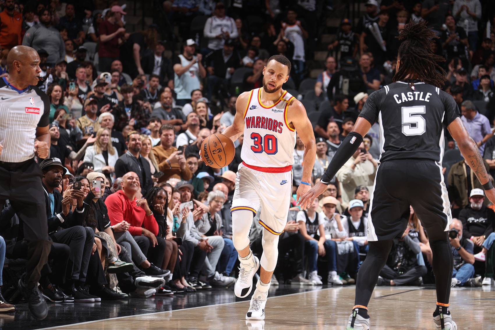 本場比賽,庫里出戰(zhàn)32分鐘,16投5中,三分10中3,罰球1中1,僅得14分,還有7板5助,另有3次失誤。卡斯?fàn)柺装l(fā)出戰(zhàn)33分鐘,15投7中(三分7中2),罰球4中3砍下19分3籃板3助攻1搶斷。