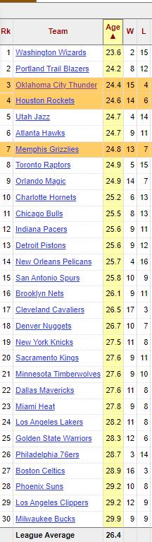 雷霆24.4歲、火箭24.6歲、灰熊24.8歲,他們的年齡分別排在聯(lián)盟倒數(shù)第3、4、7。