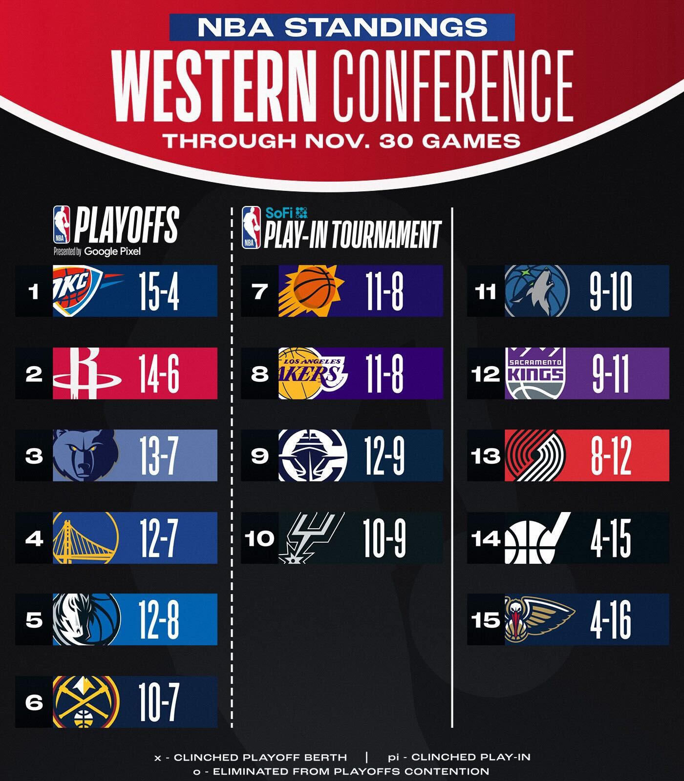 12月01日訊 截至今天,雷霆、火箭與灰熊分列西部前三。