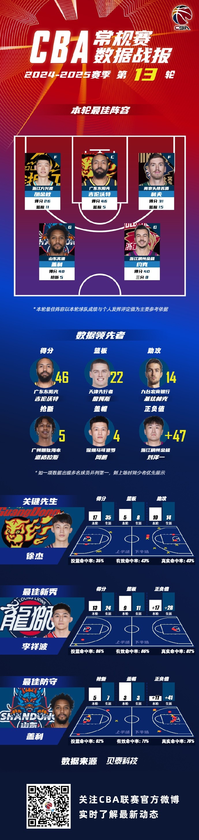 數(shù)據(jù)領(lǐng)先者方面:廣東東陽光球員吉倫沃特以單場46分的數(shù)據(jù)領(lǐng)銜得分榜;