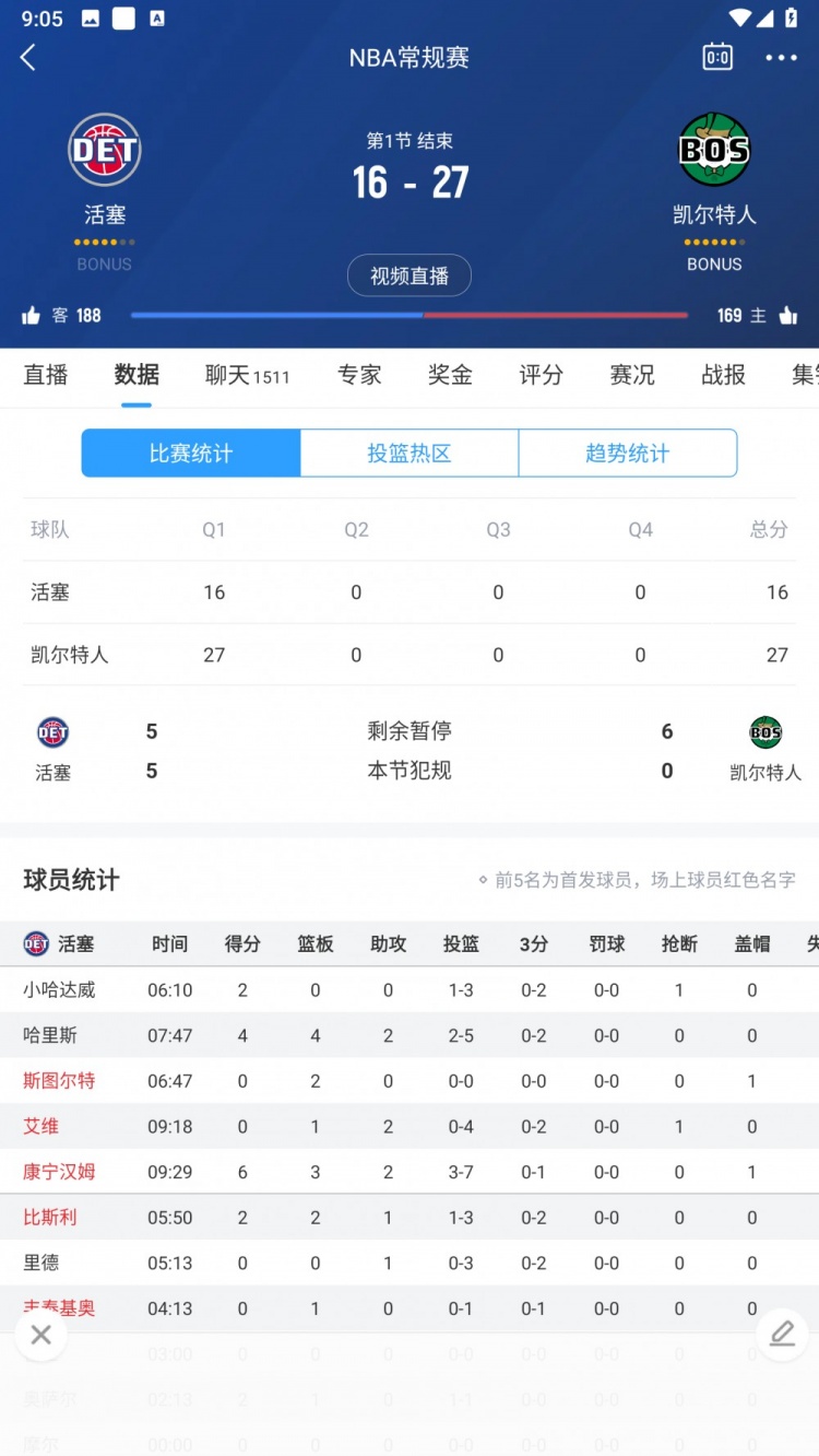 12月13日訊 NBA常規(guī)賽,活塞首節(jié)16-27落后凱爾特人。