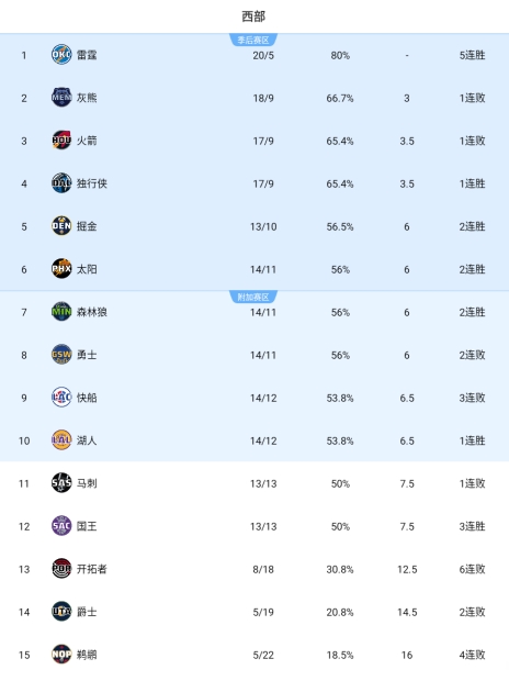 力擒西部第二湖人14勝12負追平快船排名第十 領先馬刺1個勝場