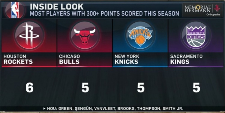 (火箭:杰倫-格林、申京、范弗里特、狄龍、阿門-湯普森、小賈巴里-史密斯得分皆300+)
