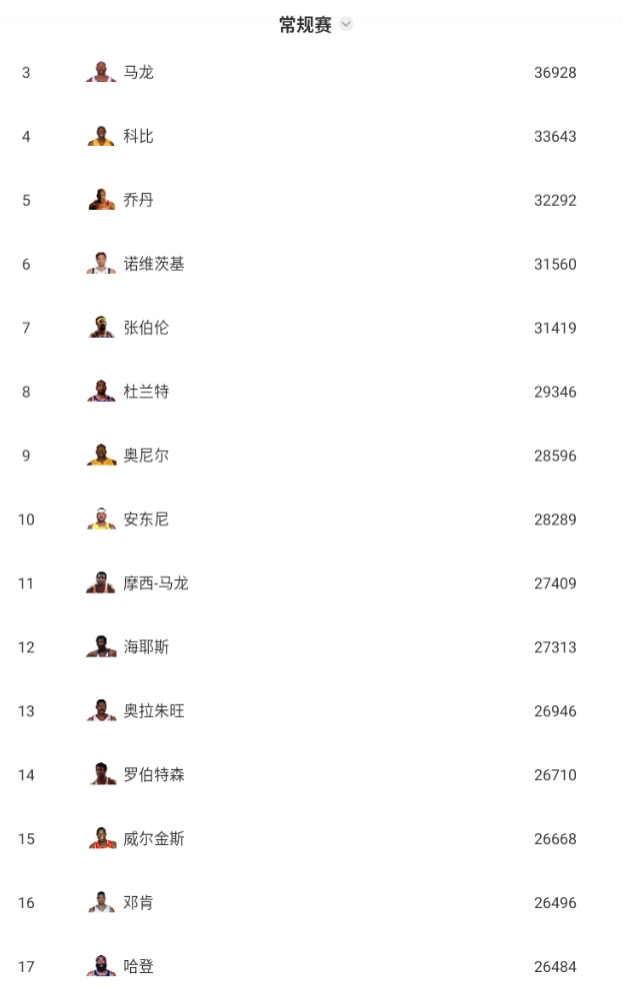 本場(chǎng)過(guò)后,哈登生涯總得分來(lái)到26484分,距離歷史第16的鄧肯還差12分。