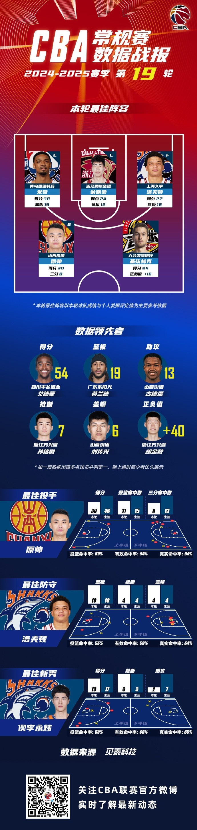 CBA常規(guī)賽第19輪最佳陣容:米奇&余嘉豪&洛夫頓&原帥&基茲林克