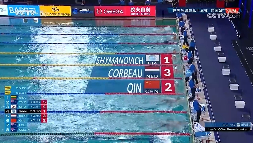 10月24日訊 在韓國(guó)游泳世界杯男子100米蛙泳決賽中,中國(guó)選手秦海洋在第六道出發(fā),最終以56秒22獲得銀牌。該項(xiàng)目的世界紀(jì)錄保持者希曼諾維奇 以56秒10獲得金牌。