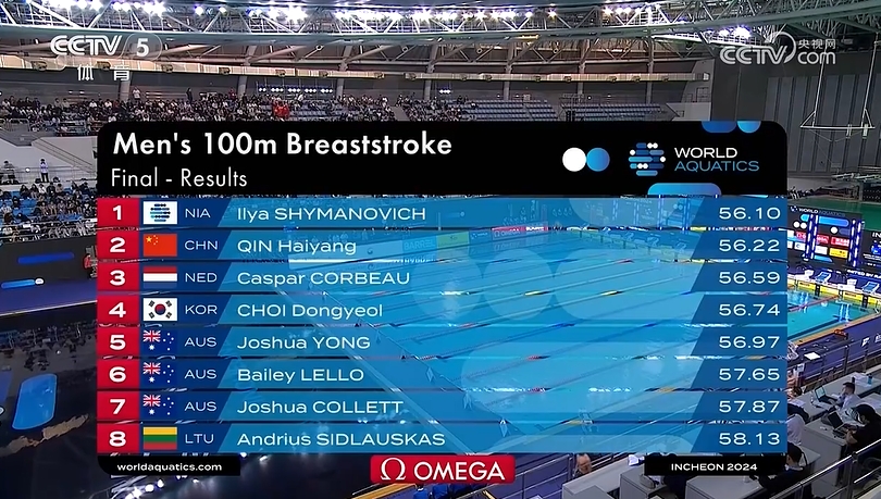再奪1銀!覃海洋56秒22獲男子100米蛙泳銀牌,世界紀(jì)錄保持者奪金