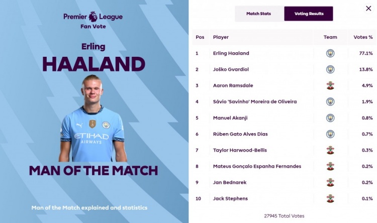 10月27日訊 在英超聯(lián)賽的第九輪比賽中,曼城主場1-0擊敗南安普頓。比賽結束后,哈蘭德被選為這場比賽的最佳球員。