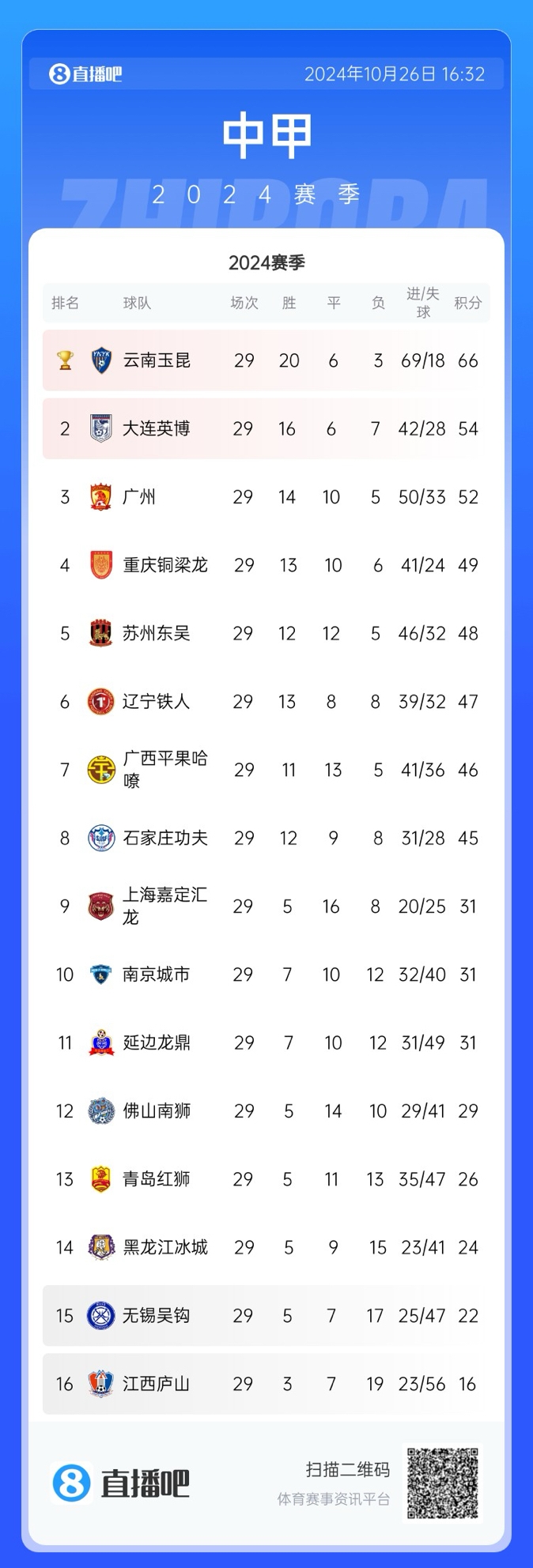 中甲積分榜:大連英博&廣州末輪爭沖超名額 青島紅獅提前保級