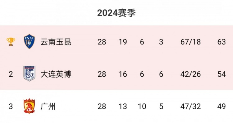 經(jīng)過28輪中甲比賽,云南玉昆已經(jīng)提前超越奪冠,大連英博54分排名第二,廣州49分排名第三。