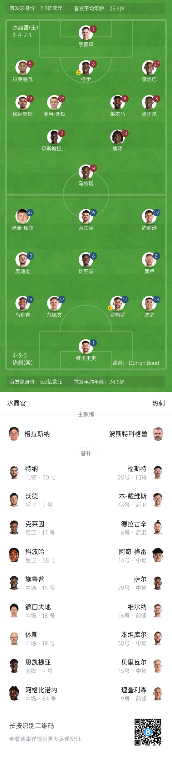 水晶宮首發(fā):1-迪恩-亨德森、12-穆尼奧斯、27-查洛巴、6-格伊、5-拉克洛瓦、3-米切爾、8-萊爾馬、20-沃頓、10-埃澤、7-伊斯梅拉-薩爾、14-馬特塔