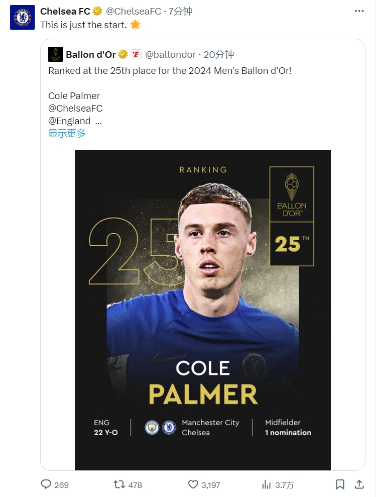 22歲帕爾默首次提名金球排名第25,切爾西:這僅僅只是開始