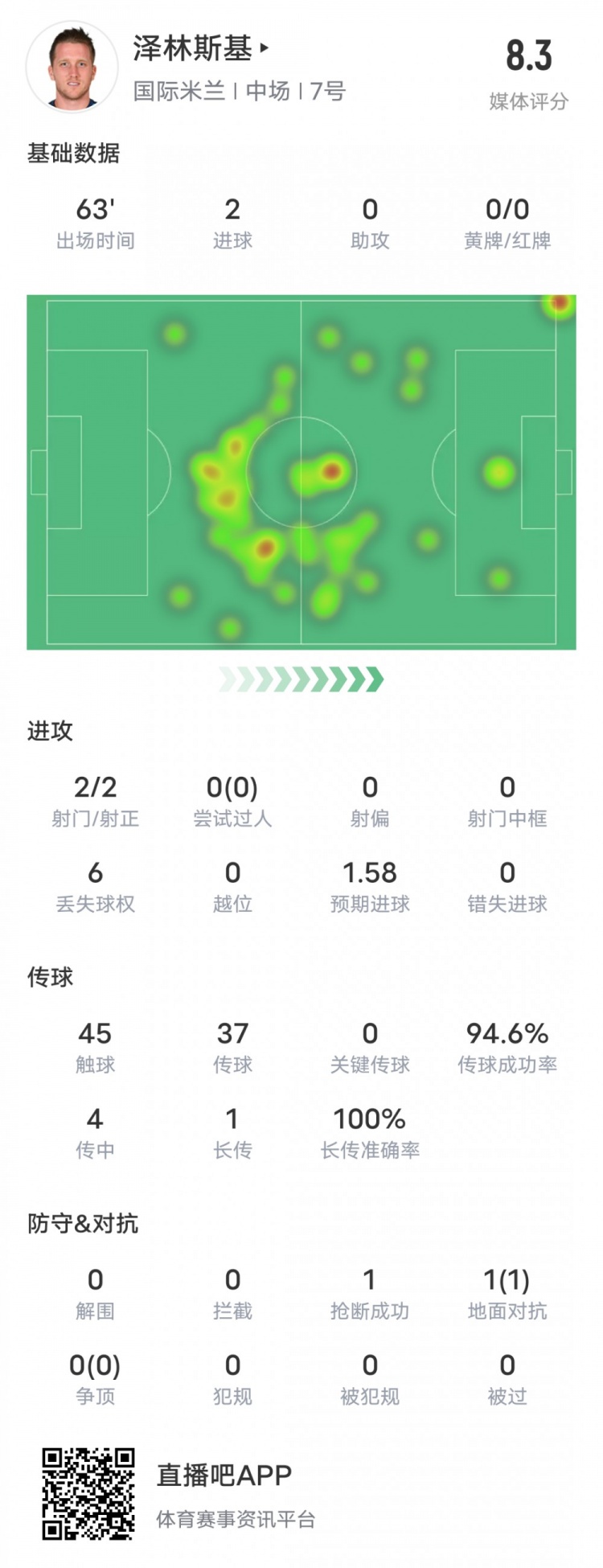 澤林斯基本場(chǎng)數(shù)據(jù):2進(jìn)球1搶斷&傳球成功率94.6%,評(píng)分8.3