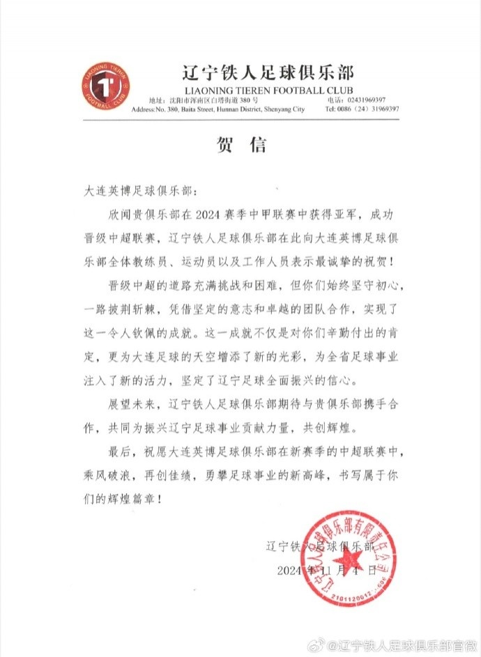 11月6日訊 遼寧鐵人俱樂部發(fā)布賀信,祝賀大連英博升入中超。