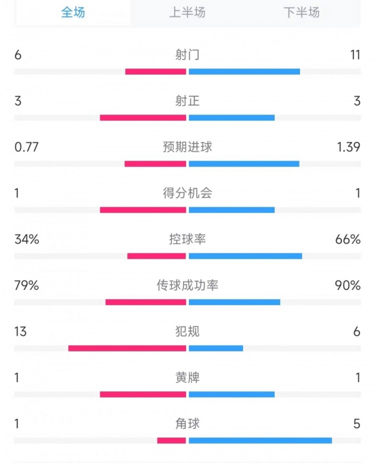 里爾vs尤文全場數(shù)據(jù):射門6比11、控球率34%比66%、犯規(guī)13比6