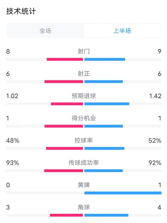 皇馬VS米蘭半場數(shù)據(jù):射門8-9,射正6-6,控球率48%-52%