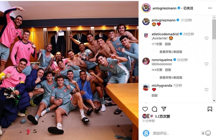 賽后格列茲曼在社交媒體上曬出球員們?cè)诟率业暮险?,慶祝球隊(duì)絕殺取勝。