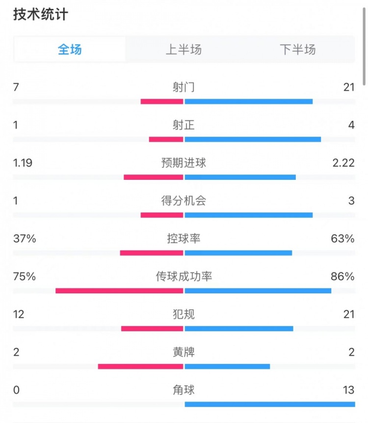 國(guó)米1-0阿森納全場(chǎng)數(shù)據(jù):射門7-21,射正1-4,角球0-13