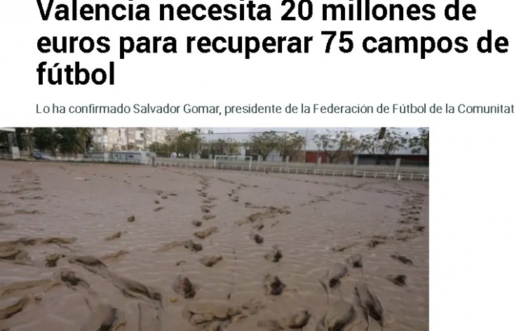 瓦倫西亞足協(xié)主席薩爾瓦多-戈馬爾表示,在受災的75個足球場中,20個球場遭到嚴重破壞,每個修復費用約40萬歐元,平均每個球場需要20萬歐元。這些球場99%為市政設施,修復工作預計需要6至8個月才能開始。