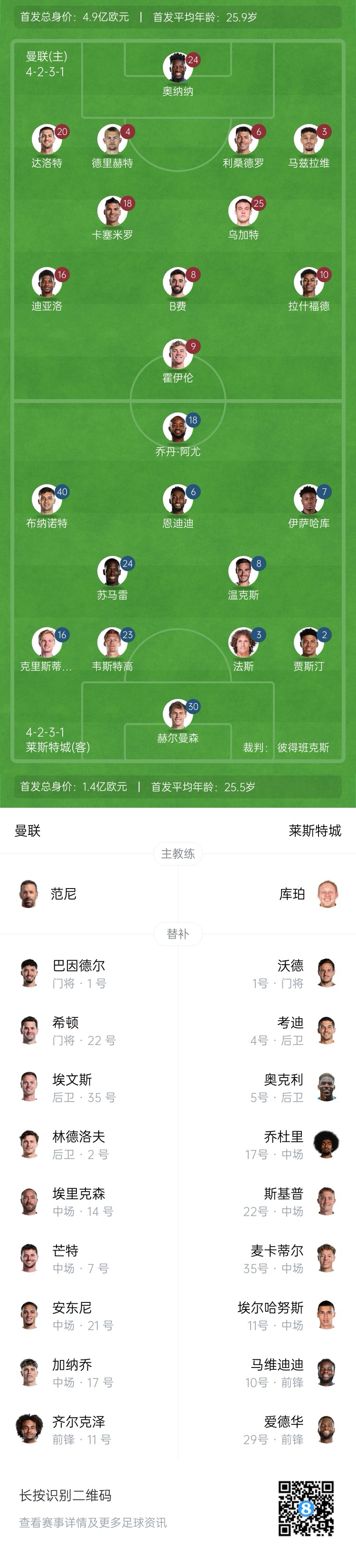 曼聯(lián)首發(fā):24-奧納納、3-馬茲拉維、4-德里赫特、6-利桑德羅-馬丁內(nèi)斯、20-達洛特、8-B費、18-卡塞米羅、25-烏加特、9-霍伊倫、10-拉什福德、16-阿瑪?shù)?迪亞洛