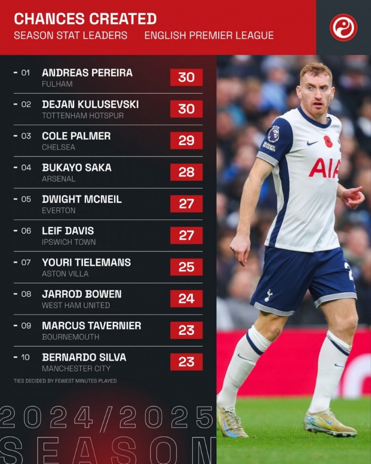 11月12日訊 Squawka統(tǒng)計(jì)了球員本賽季在英超創(chuàng)造機(jī)會(huì)的次數(shù),并列出榜單,佩雷拉、庫(kù)盧塞夫斯基創(chuàng)造30次機(jī)會(huì)居首,帕爾默29次排名第三位。
