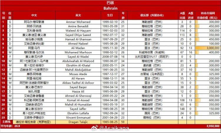 兩名尼日利亞籍歸化球員摩西-阿特德和文森特-伊曼鈕爾也入選了巴林隊此役的23人名單,其中摩西-阿特德司職中場,效力馬來西亞古晉城,身價32.5萬歐;文森特-伊曼鈕爾司職右后衛(wèi),效力巴林錫特拉,暫無參考身價,而他在俱樂部則司職右邊鋒。