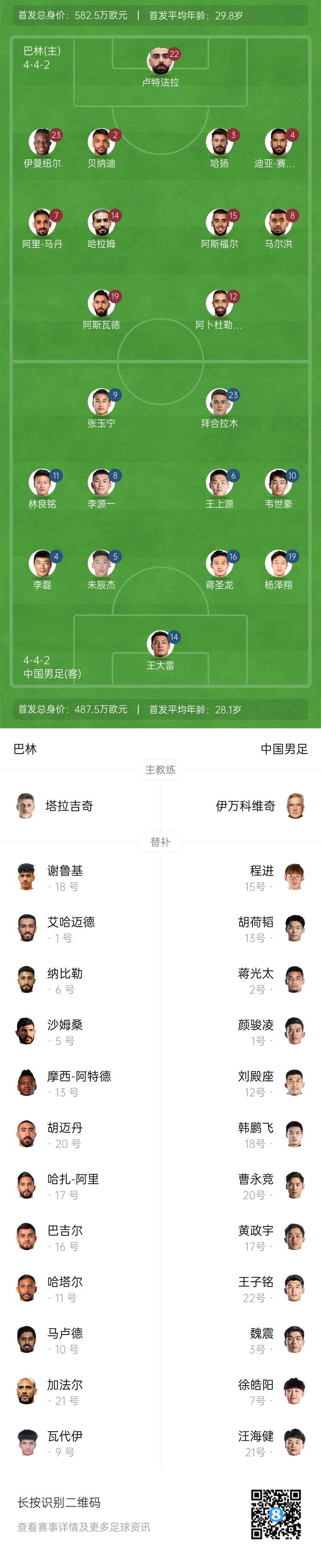 世預(yù)賽-國(guó)足vs巴林首發(fā):韋世豪、林良銘先發(fā),蔣光太替補(bǔ)