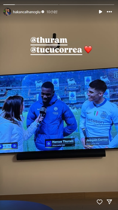 國(guó)米中場(chǎng)恰爾汗奧盧因輕傷缺席此役,他觀看了這場(chǎng)比賽的電視直播。恰爾汗奧盧在社交媒體上曬出圖拉姆、科雷亞賽后采訪的畫面,并附上心形表情符號(hào)。