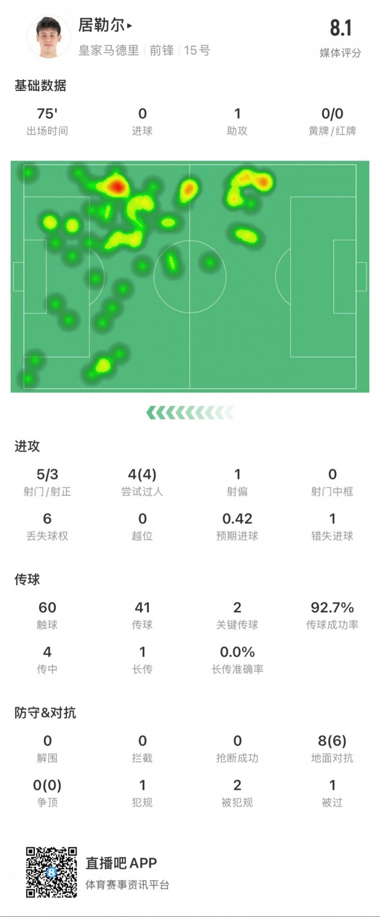居勒爾本場數(shù)據(jù):1次助攻,4次成功過人,5次射門3次射正