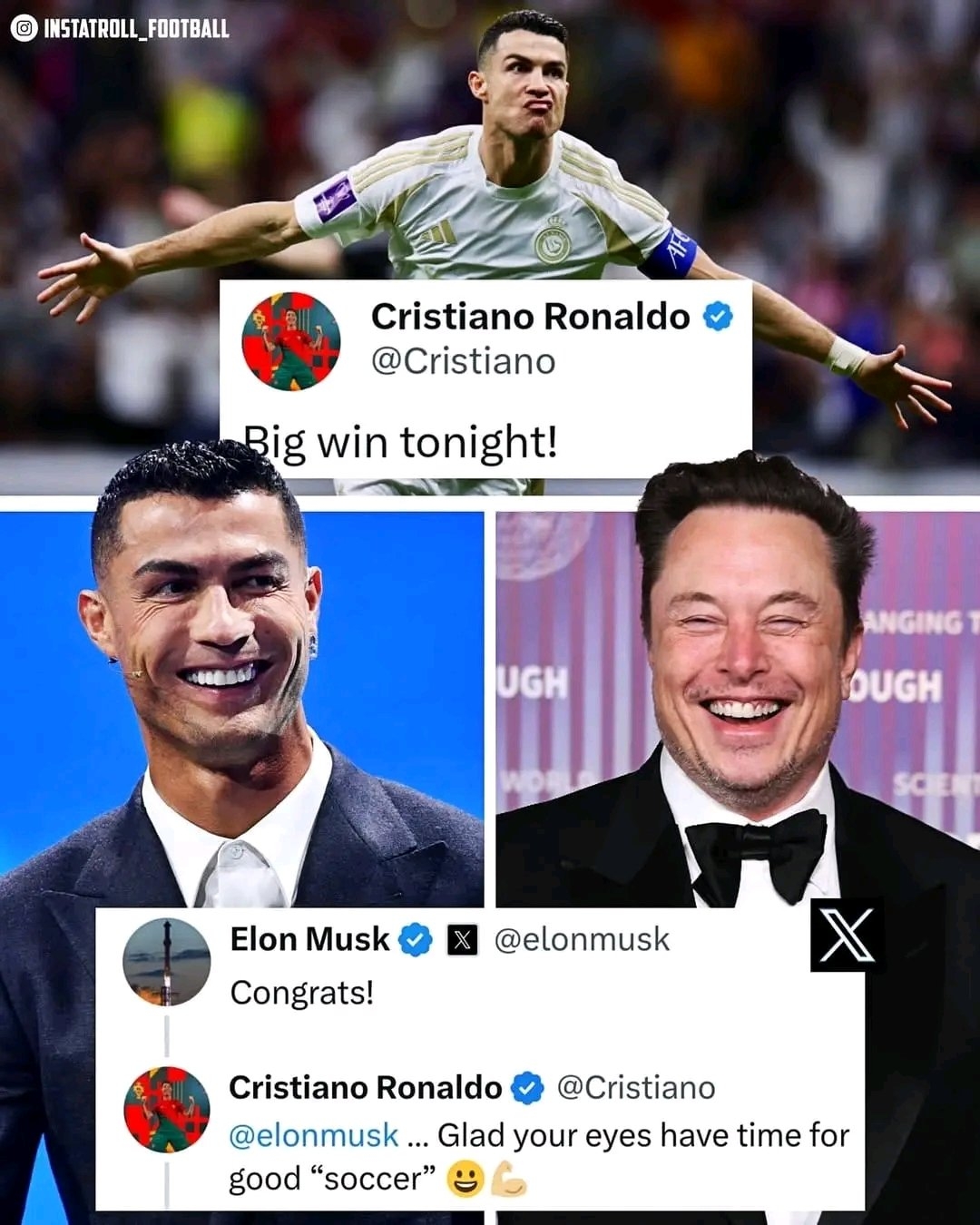 賽后,C羅在X上曬照慶祝球隊取勝,馬斯克評論祝賀:“恭喜?!?/p>