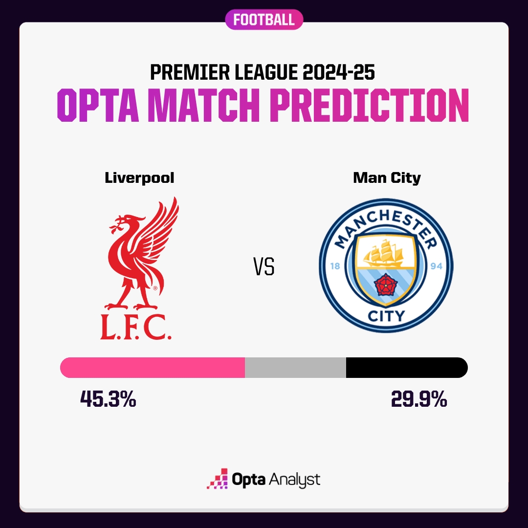 Opta預(yù)測利物浦vs曼城:利物浦勝率45.3%,曼城勝率不足3成