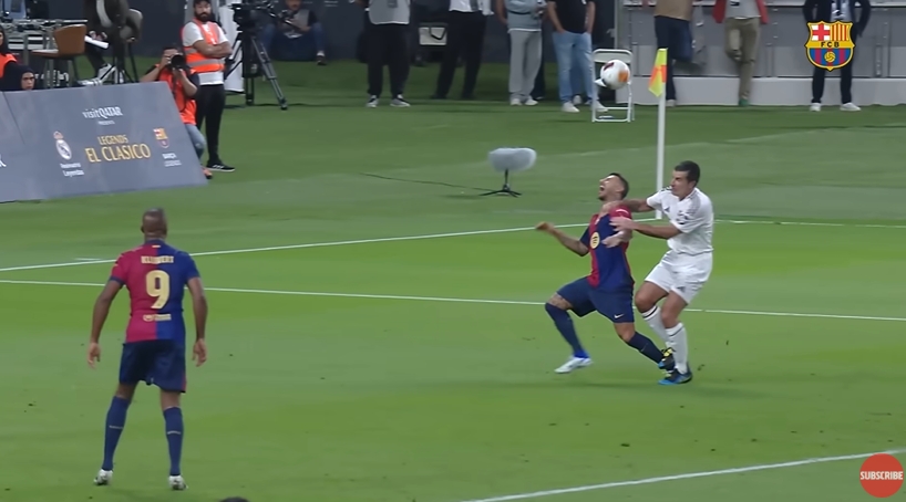 比賽下半場,菲戈在禁區(qū)內(nèi)和夸雷斯馬發(fā)生碰撞,裁判吹罰菲戈犯規(guī),判給巴薩點(diǎn)球。