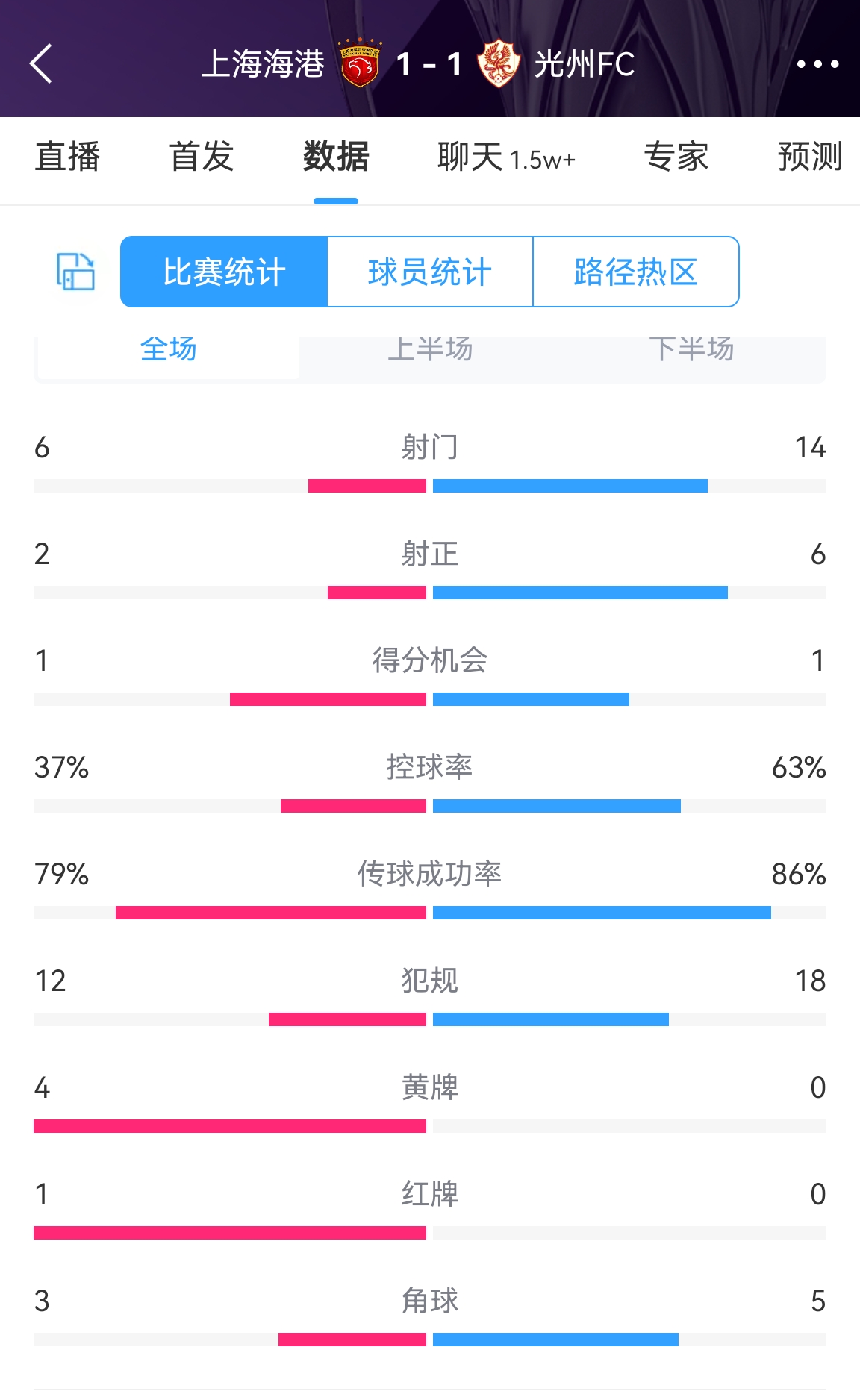 海港1-1光州數(shù)據(jù):海港少一人陷被動(dòng),射門6比14、控球不足4成