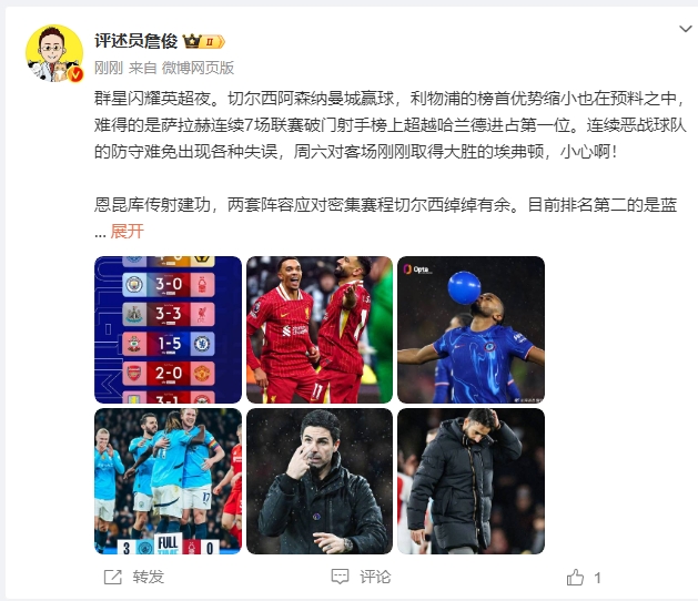 12月05日訊 本輪英超結(jié)束多場對決,評述員詹俊發(fā)文點評。