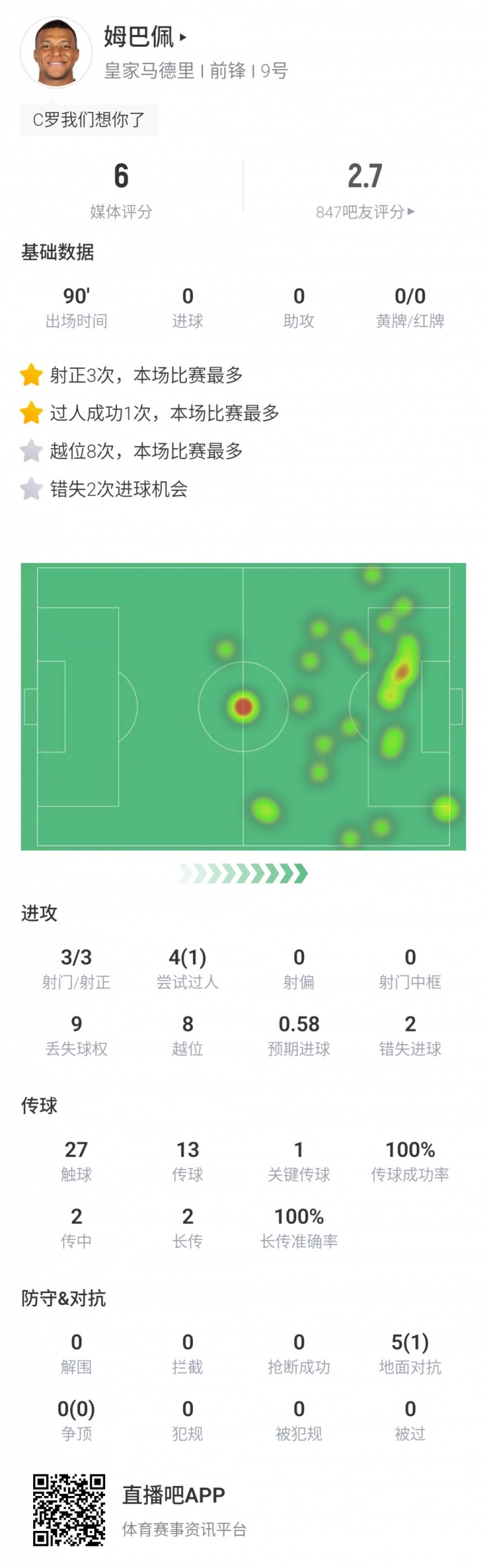 在皇馬0-4大敗巴薩的比賽中,姆巴佩出現(xiàn)了多達8次越位,一些教練組成員認為姆巴佩沒有展現(xiàn)出足夠的專注度,因為球隊賽前專門就巴薩的高位防線進行了訓練。