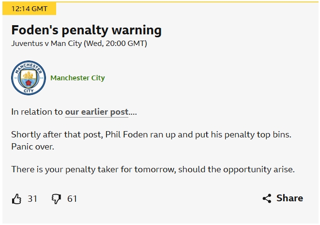 BBC在不久后更新了一段報(bào)道,稱福登后來又罰了一次點(diǎn)球,并命中上死角,結(jié)束了訓(xùn)練場(chǎng)的“恐慌”。
