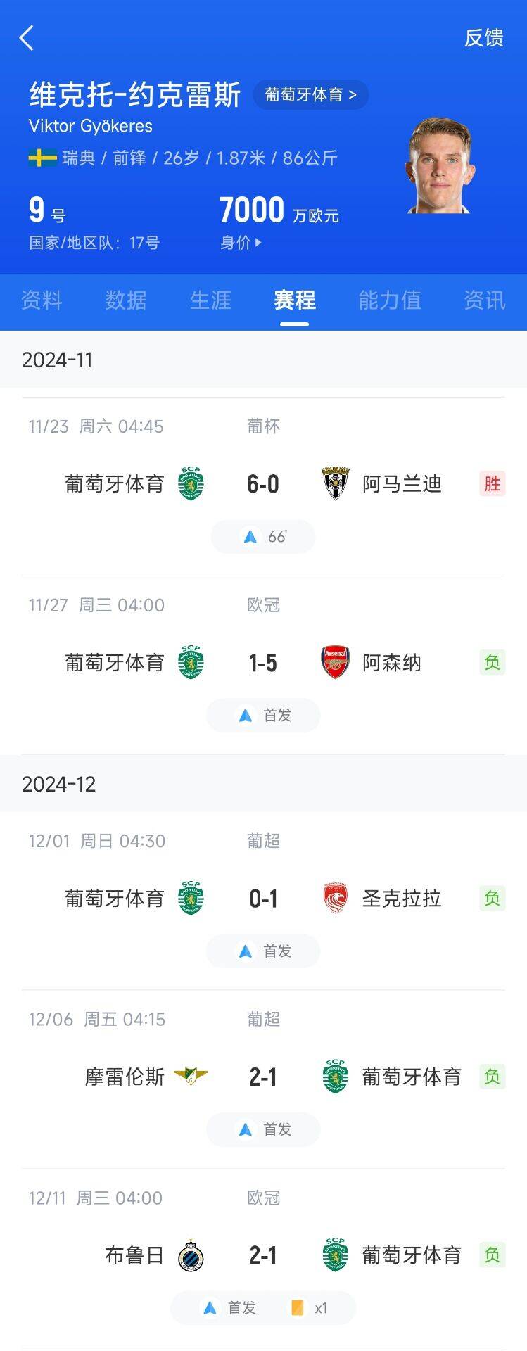 26歲的約克雷斯在此前是超級(jí)熱門的中鋒,身價(jià)高達(dá)7000萬歐,多家豪門均垂涎欲滴。在阿莫林執(zhí)教時(shí)期,約克雷斯18場23球效率極其驚人。但在阿莫林離隊(duì)前往曼聯(lián)之后,約克雷斯5場比賽僅有2粒點(diǎn)球入賬,最近的4連敗,他也有3場比賽啞火,未能幫助球隊(duì)。約克雷斯的說明書,仿佛也被阿莫林帶走了一樣……