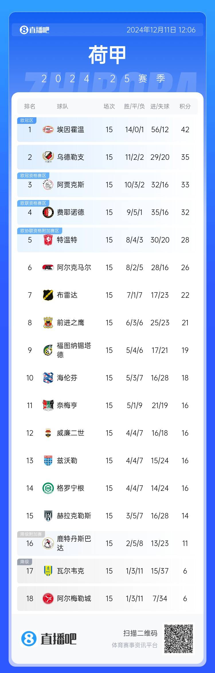 爆冷埃因霍溫7分領(lǐng)跑荷甲15場轟56球,負(fù)于法甲第11布雷斯特