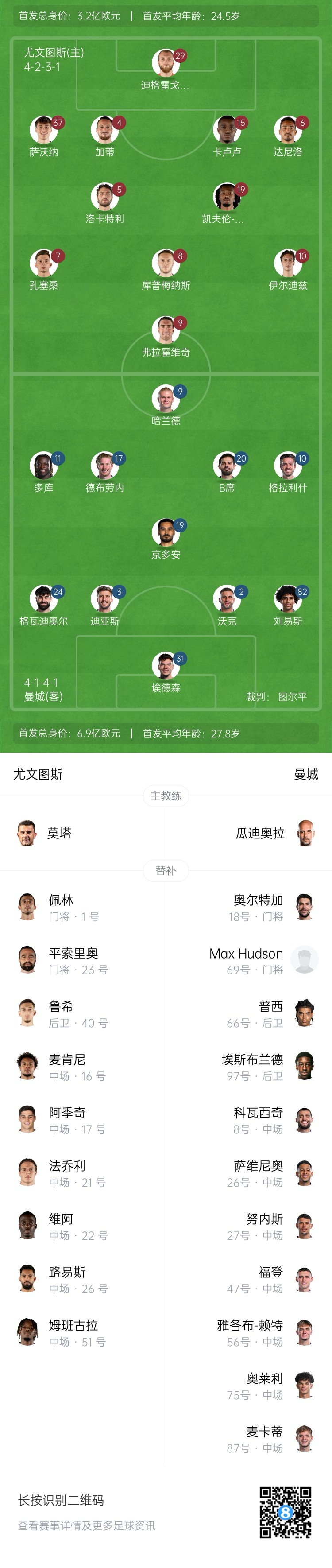 12月12日訊 歐冠聯(lián)賽階段第6輪 尤文圖斯vs曼城,賽前首發(fā)名單公布。