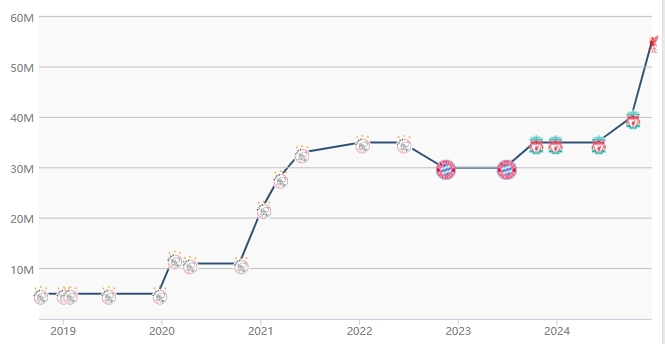 12月16日訊 今日德國轉(zhuǎn)會市場更新英超球員身價,其中22歲利物浦中場赫拉芬貝赫身價上漲1500萬歐,至5000萬歐。