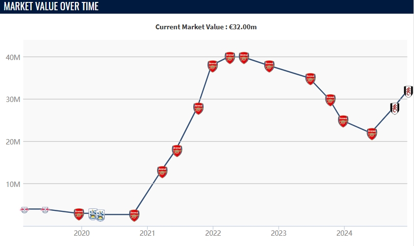 今夏阿森納以2700萬英鎊+700萬英鎊浮動(dòng)的轉(zhuǎn)會(huì)費(fèi)將24歲的史密斯-羅出售至富勒姆,球員本賽季代表富勒姆聯(lián)賽出戰(zhàn)16場,已經(jīng)貢獻(xiàn)3球2助。球員在2022年巔峰身價(jià)為4000萬歐元,目前球員距離這一數(shù)字還差800萬歐。