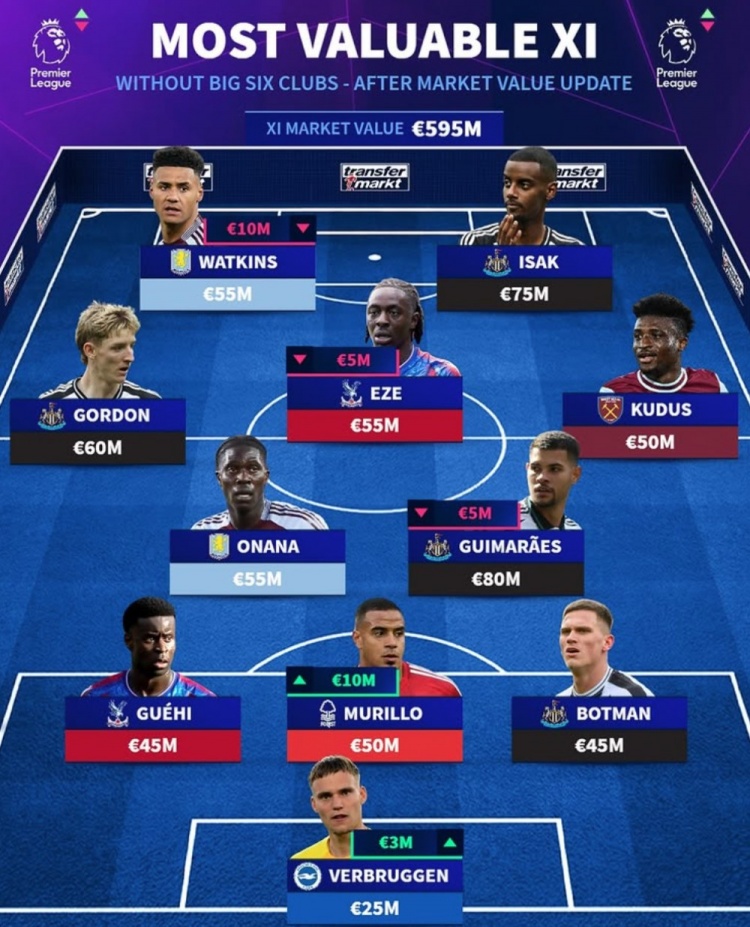 德轉(zhuǎn)列英超非BIG6最貴陣:伊薩克領(lǐng)銜紐卡4將 格伊、沃特金斯在列