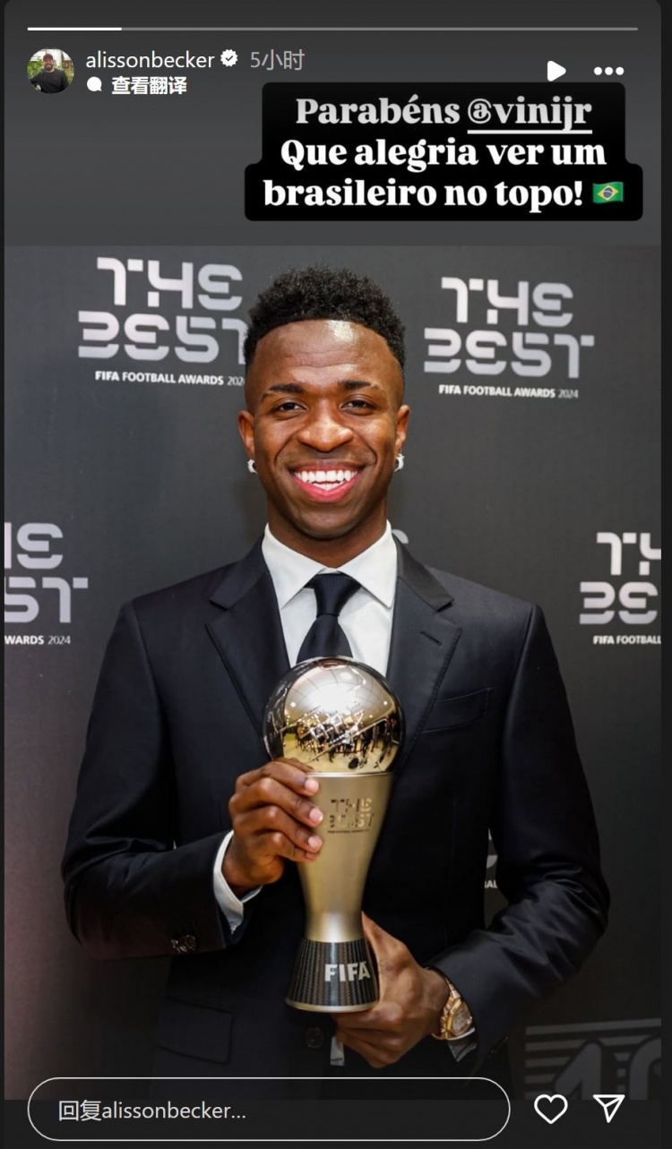12月18日訊 巴西前鋒維尼修斯當(dāng)選FIFA2024年度最佳球員,巴西門將阿利森社媒祝賀。