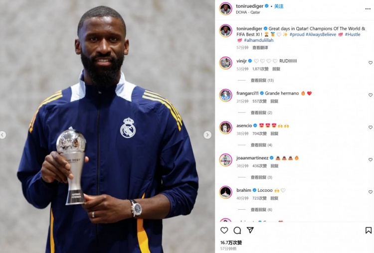 呂迪格社媒曬照:在卡塔爾入選年度最佳陣并成為世界冠軍