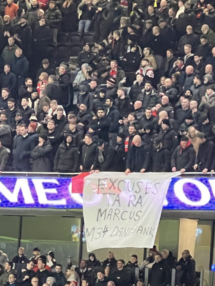 有遠(yuǎn)征的曼聯(lián)球迷拉了橫幅,對(duì)拉什福德表示不滿。橫幅上寫(xiě)道:又找借口,再見(jiàn)吧拉什福德。