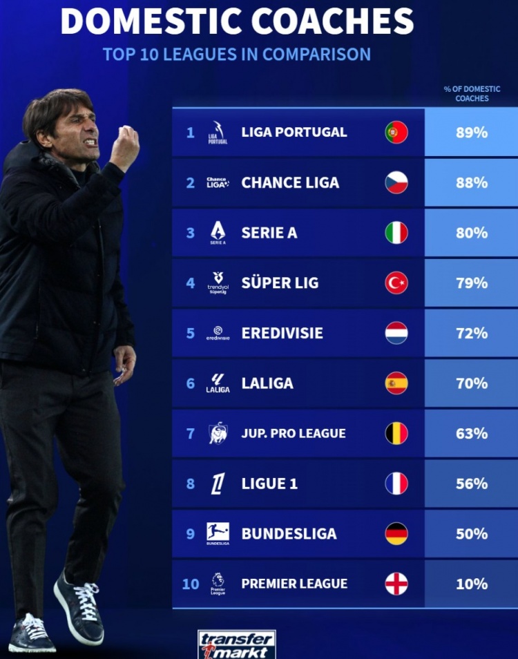 歐洲十大聯(lián)賽本國主帥占比:英超10%最低,德甲50%、意甲80%
