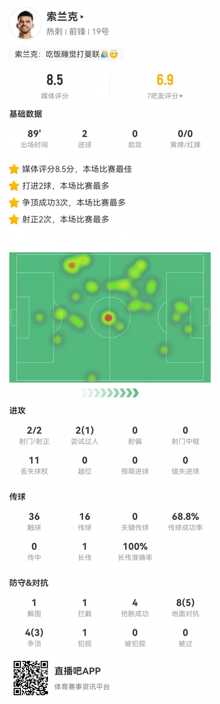索蘭克本場2射進(jìn)2球 12對抗8成功+4搶斷 獲評8.5分全隊最高