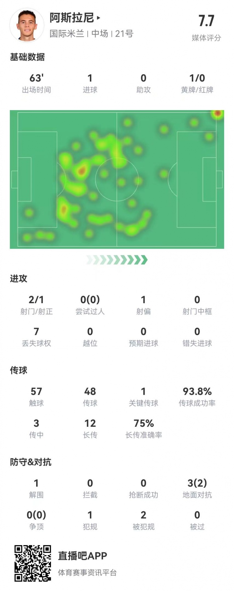 12月20日訊 國米在本輪意大利杯對陣烏迪內(nèi)斯,阿斯拉尼本場數(shù)據(jù)如下:
