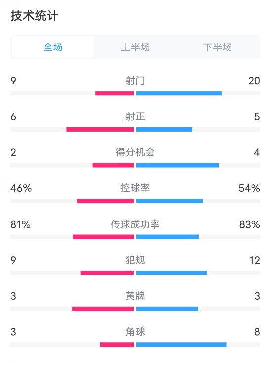 熱刺4-3曼聯(lián)全場數(shù)據(jù):射門9-20,射正6-5,控球率46%-54%